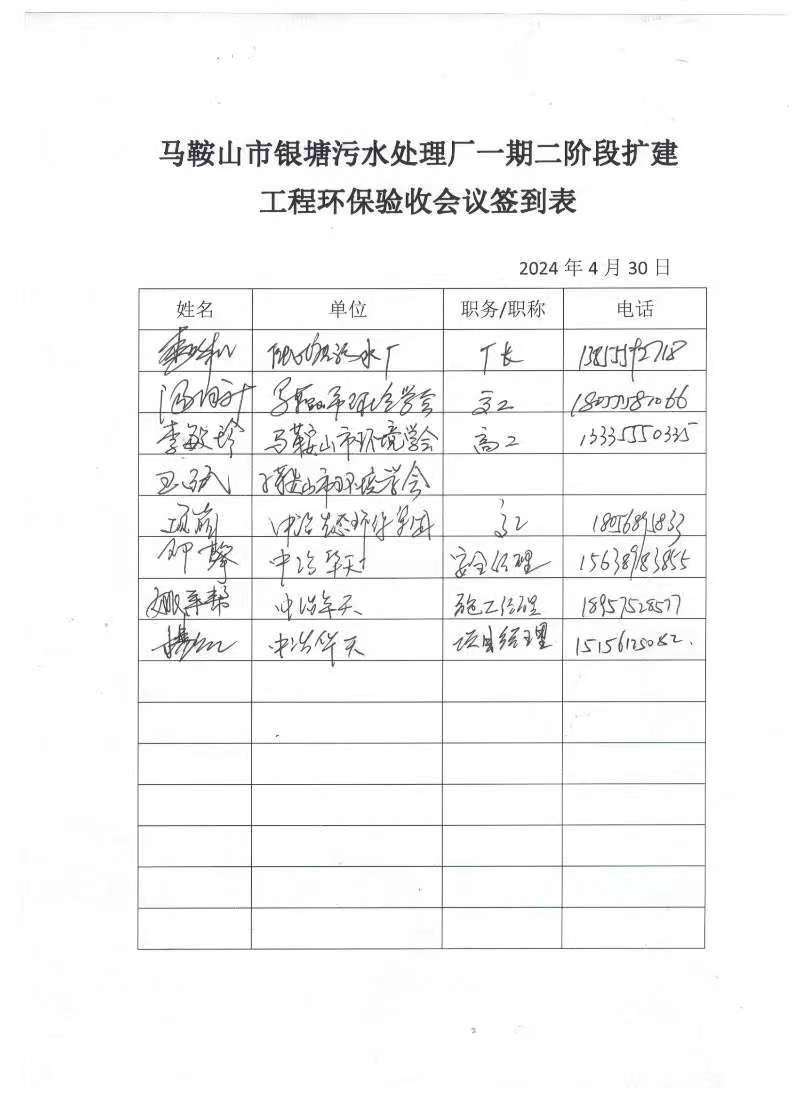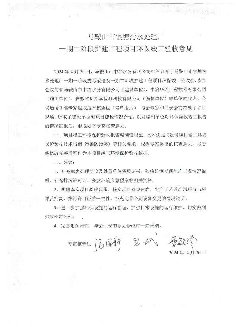 马鞍山市银塘污水处理厂一期二阶段改扩建工程项目根据《建设项目环境保护管理条例》、《建设项目竣工环境保护验收暂行办法》等相关规定于2024年4月30日组织召开竣工环境保护验收会。会议按照相关要求由马鞍山市中冶水务有限公司(建设单位)、易游官方网站工程技术有限公司(施工单位)、安徽省贝斯泰检测科技有限公司(编制单位)等单位的代表,会议邀请3名专家组成技术核查组,工作组通过现场勘查、询问、讨论等方式最终形成了验收意见,意见认为项目具备环境保护验收条件,项目验收合格。现将相关资料给予公开,公示期为2024年5月11日至2024年5月26日。公示期间公众可通过电话或者邮件与我公司联系。